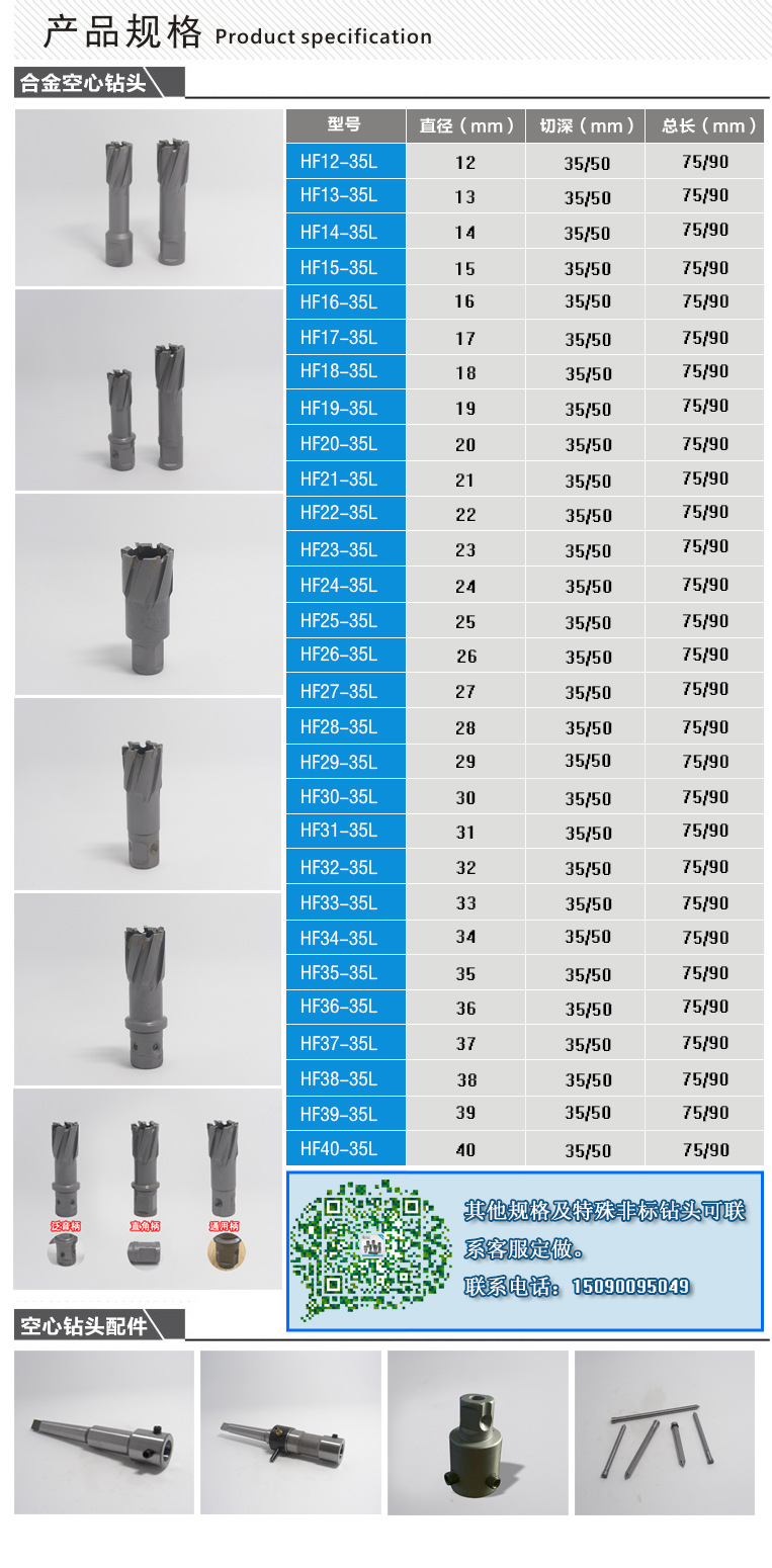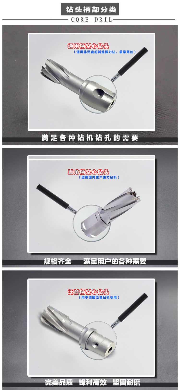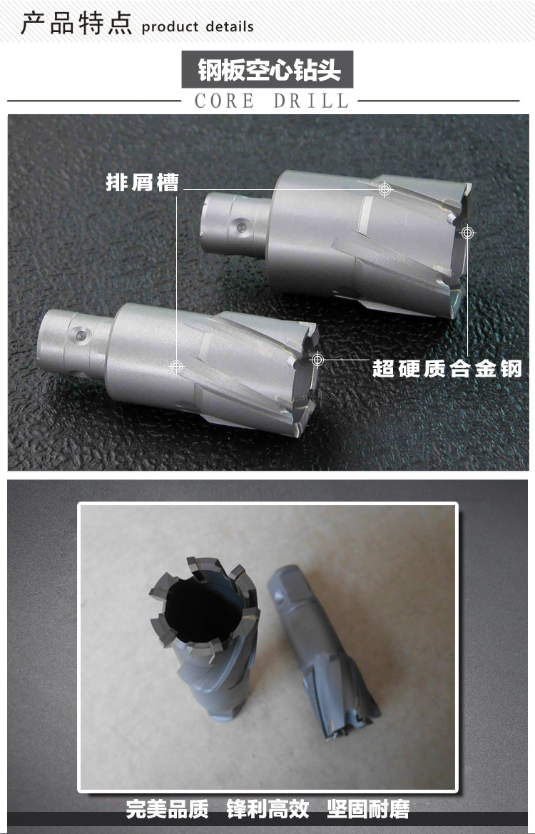 产品详情: 红福空心钻是不间断的空心钻,由优质硬质合金制成,强度高,耐磨性好,稳定性好,钻孔速度是平常麻花钻的7倍,钻孔光滑,无毛刺。适用于各种电磁钻机,台式钻机摇臂钻机,可以接纳定制的非标准尺码