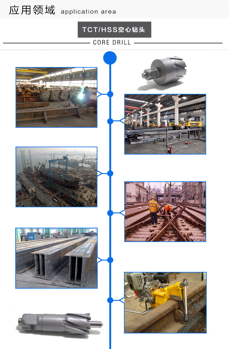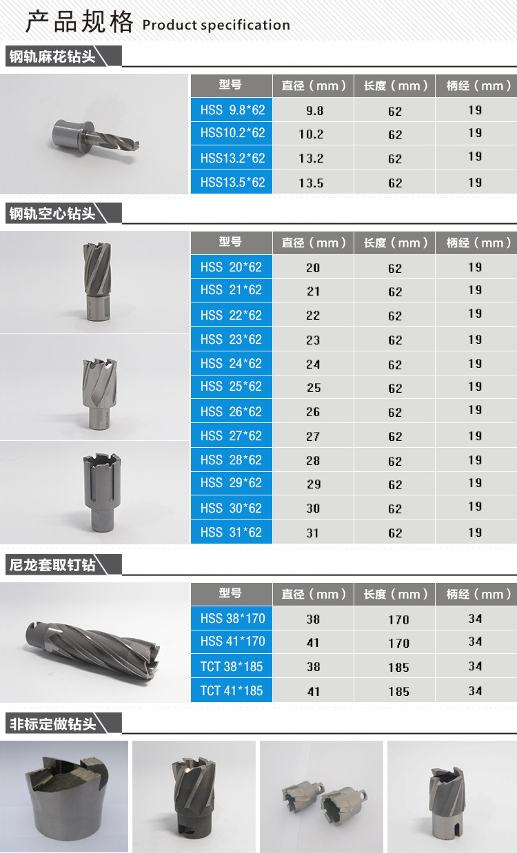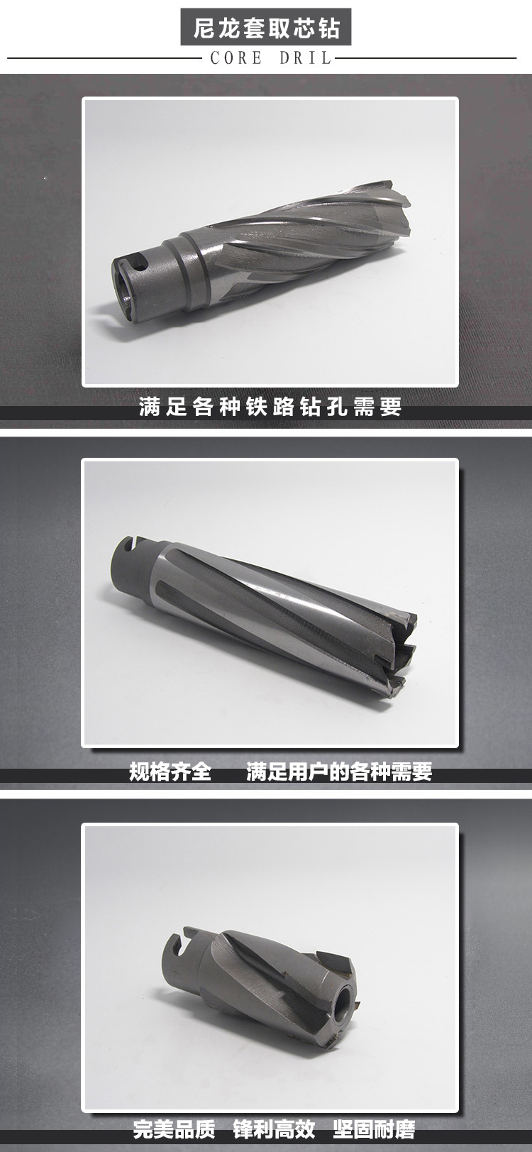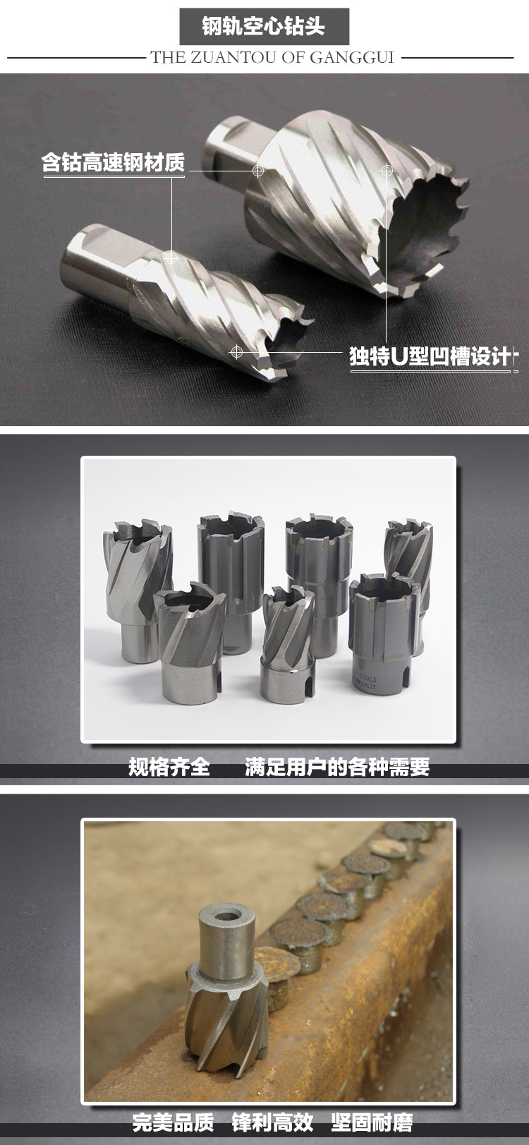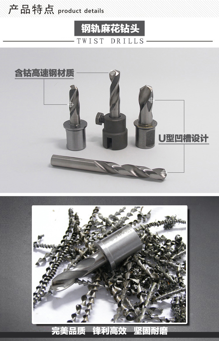 产品详情:轨道钻头分成高速钢系列和硬质合金系列。它们与铁路钻孔机一齐用到,是铁路维护中必备的钻孔工具。它们兼具多个切削刃,不错的耐磨性和较高的钻孔精度。,钻削效率是一般而言麻花钻的两倍,一个钻头一次可以在最坚硬的材质的钢轨上钻40-50个孔,钻头磨损后可以连续研磨十次以上;另一种硬质合金钢轨道钻,钻头由高强度硬质合金刀片焊接而成,具钻孔寿命长,刀片磨损不佳,钻头破损不佳等优点,并可多次磨削。穿后。